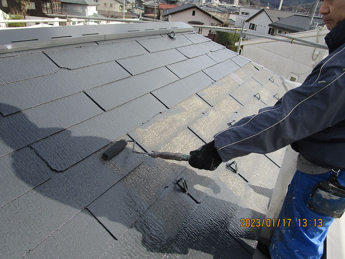 こんにちは!山田塗装店ピーちゃんです\(^o^)/今日は屋根の塗替えを行っている現場にお邪魔してきたピヨ♪こちらはコロニアルという屋根材で、お色はグレー!!!!!今日は天気も調度いいので午後から引き続き頑張るピヨ(^^♪