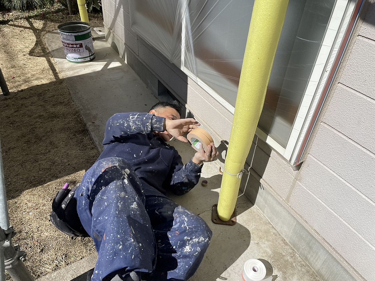 皆さんこんにちは!山田塗装店ピーちゃんです!!今日の職人さん、地面に寝そべって何をしているでしょう...?実はこれ、綺麗に塗装をするために必要な作業で塗装をする前に養生テープで養生をしているんだピヨ(^^)/塗料が飛んでもテープで保護されているおかげで真っすぐ綺麗な塗装ができるんだピヨ(*´ω`*)こういった職人さんたちの細かな作業の頑張りが仕上がりに繋がってくるんだねっ(^_-)-☆