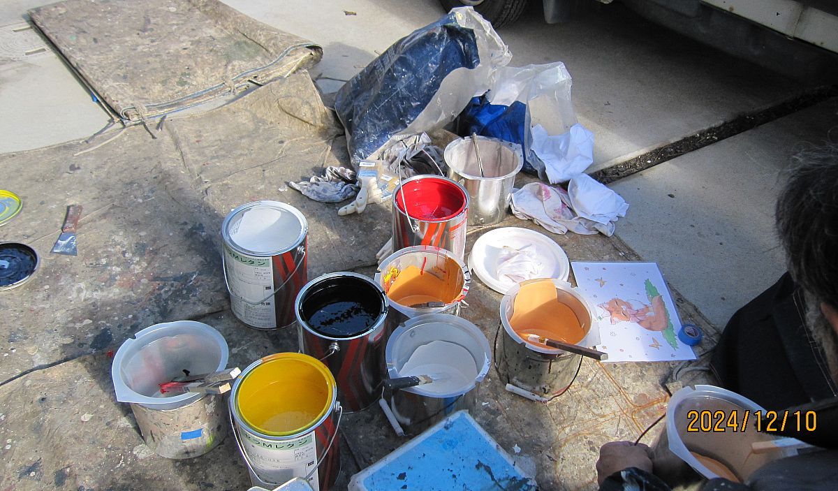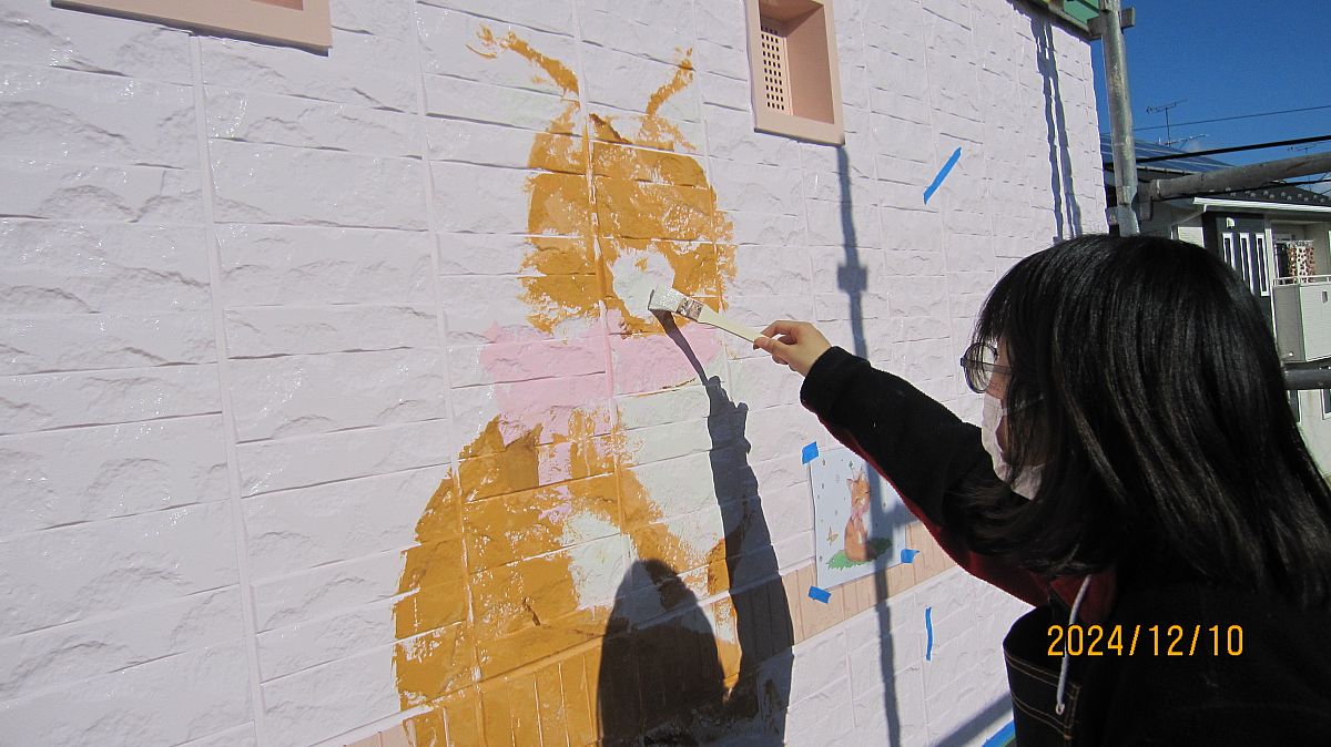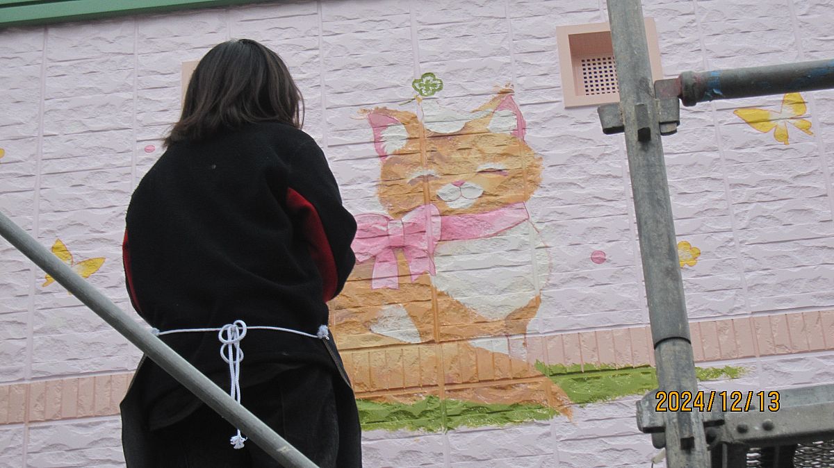 みなさん、こんにちわ!毎日寒いですねぇ...(*_*)そんな寒い中、もくもくとイラストを描いてるスタッフさん!ねこちゃんのイラストがとってもきれいに仕上がってきましたよ(*'▽')外壁のでこぼこが毛並みに見えてきましたね!ほんとうに仕上がりが楽しみです♪