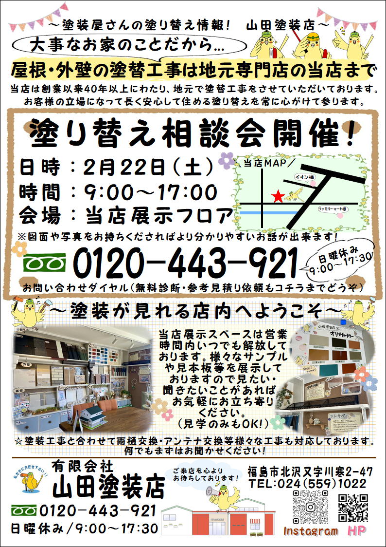 みなさん、こんにちわ!今週22日の土曜日は、2件の相談会を開催いたします!!まず会社相談会のご紹介(^^♪展示室が改装し、様々な見本を見ながらご説明できます!ぴーちゃんかふぇもありますので、ほっと一息つきがてらお話してみませんか?次は、国見町での相談会です!あつかしの郷(道の駅)での開催です(^^♪お買い物のついでに、おうちの気になるところをお話してみませんか?もちろんご相談は無料で行っておりますのでご安心くださいね~!