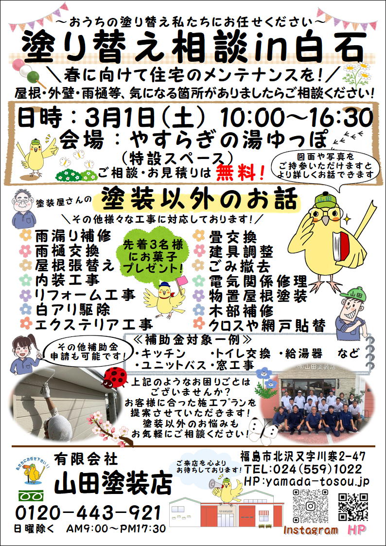 みなさん、こんにちわ!先週に引き続き、今週も出張相談会開催いたします♪白石は、【ゆっぽ】様という温泉施設にてお待ちしております!保原は、保原駅内の【コミュニティセンター】にて開催です('◇')ゞ先着でプレゼントもご用意しておりますので、お気軽にお声がけくださいね( ^^) _旦~~
