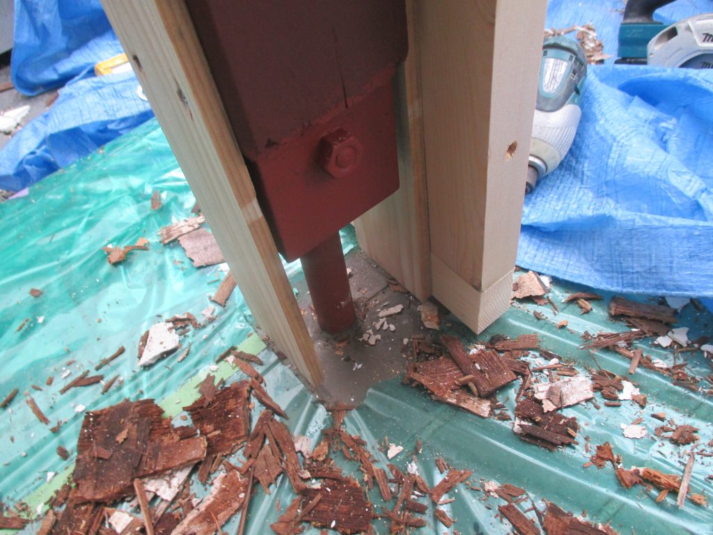 玄関のペンキで塗装してある木柱をタイル調に豪華にしたいと施主様から依頼がありました。