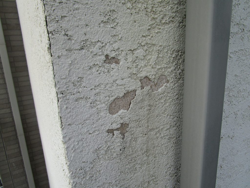 外壁下地にクラックからの湿気が入り塗装面のはがれが見られました。クラック補修したのち同じ塗材で柄調整しました。