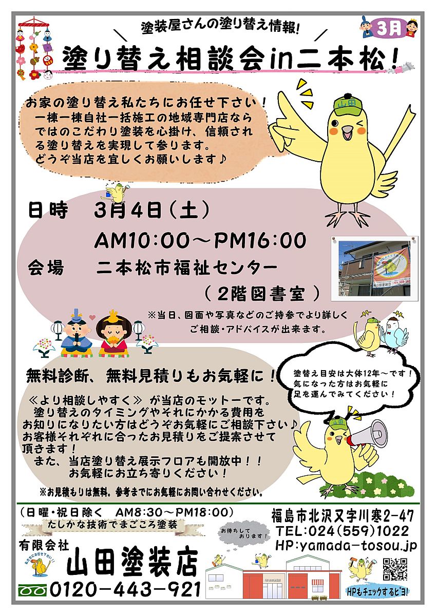 皆さんこんにちは!山田塗装店スタッフです!!本日、二本松と保原にて塗り替え相談会を同時開催しております(^_-)-☆是非会場へ!お気軽にお立ち寄りください♪