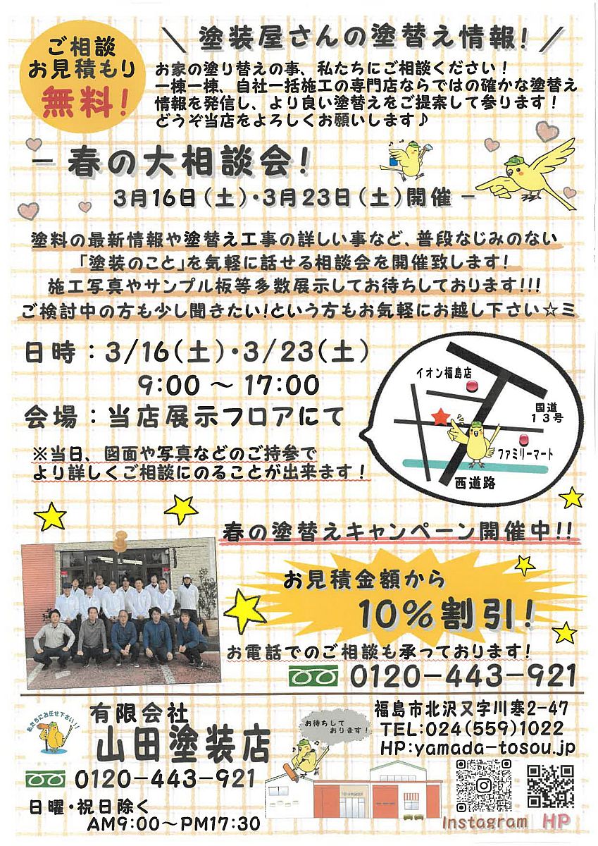 こんにちは!暖かくなったかと思いきやまた肌寒い日が増えた今日この頃ですが・・・明日、来週は会社にて相談会です!(^^)/今回は2週にわたり開催致します!!明日難しい方には来週もありますので安心ですね(>_<)お家に関するお悩み事や、もちろん塗装に関すること、気になることや不安な点がある方は是非ご相談ください!スタッフ一同お待ちしております( ^^)☆