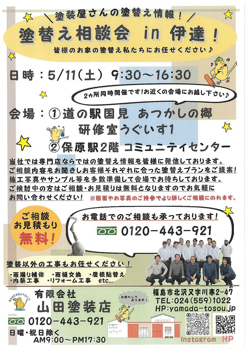 みなさん、こんにちは!ゴールデンウイークは楽しく過ごせましたか(^O^)?連休明けは体調が崩れやすいので、ゆったりと日常生活に戻していきましょうね(^^)vさて、今週の土曜日は相談会を2カ所同時開催いたします!!国見と保原へ出張予定ですのでぜひお近くの会場までお越しくださいね~!塗替えだけではなく、おうちの困りごとがあれば気軽にお話しくださいね(^^)vお待ちしておりま~す!!