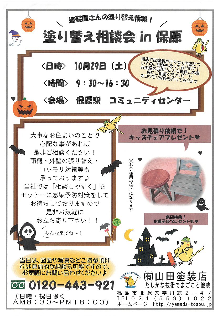 皆さんこんにちは!山田塗装店のピーちゃんです!この度、2022年10月29日(土)に保原相談会を開催します!!!!!詳細は下記チラシをご覧ください✨皆さんのお越しをお待ちしております!
