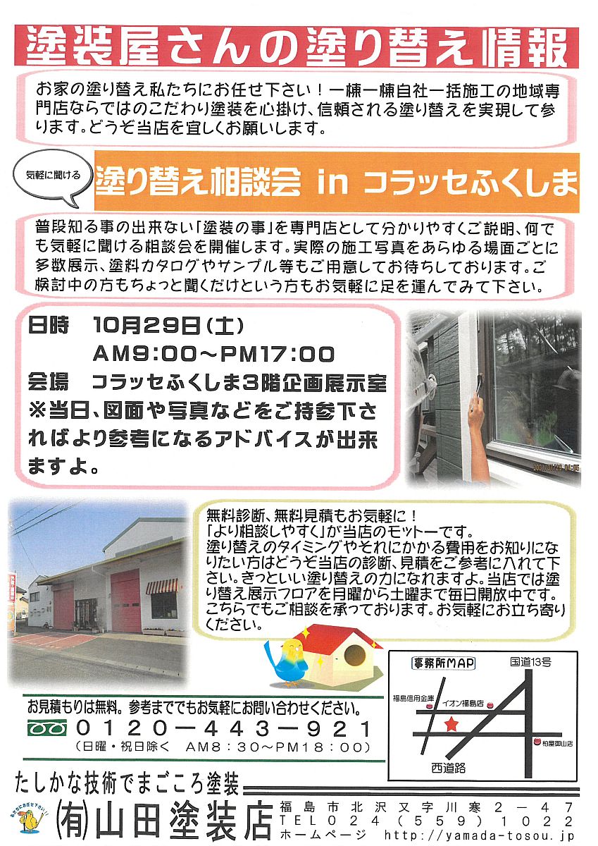 皆さんこんにちは~!!山田塗装店ピーちゃんです!なんとこの度、、保原とコラッセふくしまにて相談会の同時開催が決定しました~!(^^)!詳しい内容は下記チラシにてご確認ください。気になった方は会場へGOピヨ~~!!!