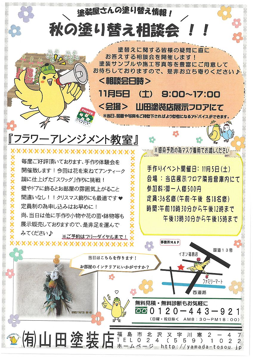 皆さん、こんにちは~!山田塗装店のピーちゃんです!この度、山田塗装店展示フロアにて、手作りイベントを開催します!!今回はなんと、ドライフラワーをアンティーク調に仕上げた【スワッグ】作りに挑戦します!皆さんのご応募を楽しみにお待ちしてるピヨ~!!